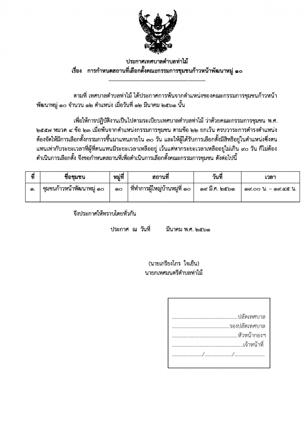 เรื่อง การกำหนดสถานที่เลือกตั้งคณะกรรมการชุมชนก้าวหน้าพัฒนาหมู่ 10