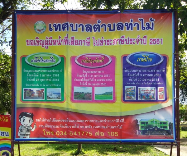 กองคลัง เทศบาลตำบลท่าไม้ ขอเชิญผู้มีหน้าที่เสียภาษีไปชำระภาษีประจำปี ๒๕๖๑ เพื่อให้การจัดเก็บรายได้เป็นไปอย่างทั่วถึงและเป็นไปตามระยะเวลาที่กำหนด และให้การบริหารงานพัฒนาท้องถิ่นเป็นไปอย่างมีประสิทธิภาพ รับยื่นแบบแสดงรายการเพื่อเสียภาษี ณ สำนักงานเทศบาลตำบลท่าไม้ ตั้งแต่วันที่ ๔ มกราคม ๒๕๖๑ ในวันจันทร์ถึงวันศุกร์ เวลา ๐๘.๓๐ น. - ๑๖.๓๐ น. เว้นวันหยุดราชการ ติดต่อสอบถามเพิ่มเติมได้ที่ โทร. ๐ ๓๔๕๔ ๑๗๗๕ ต่อ ๑๐๕ ค่ะ