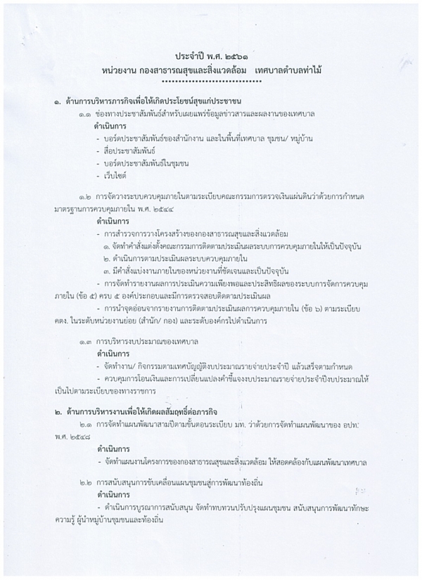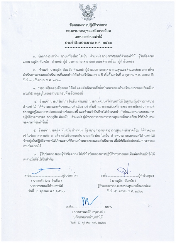 ข้อตกลงการปฏิบัติราชการกองสาธารณสุขฯ เทศบาลตำบลท่าไม้ ประจำปีงบประมาณ ๒๕๖๑