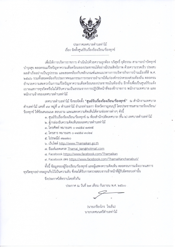 เรื่อง จัดตั้งศูนย์รับเรื่องร้องเรียน/ร้องทุกข์