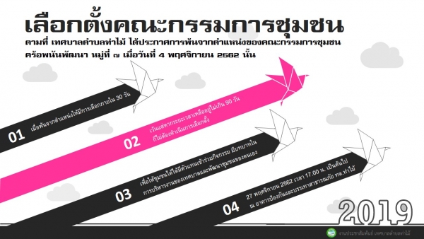 เทศบาลตำบลท่าไม้ กำหนดจัดการเลือกตั้งคณะกรรมการชุมชน (ชุมชนคร้อพนันพัฒนา) หมู่ที่ ๗ ขึ้น เพื่อให้ชุมชนฯ ได้มีตัวแทนในการเข้าร่วมกิจกรรมของทางเทศบาล รวมทั้งเข้ามามีบทบาทในการบริหารงานของทางเทศบาล เป็นการส่งเสริมให้กรรมการชุมชนเข้ามามีบทบาทและมีส่วนร่วมในการแก้ปัญหาและพัฒนาชุมชนของตนเอง โดยบูรณาการร่วมกันระหว่างภาครัฐหรือภาคเอกชน จึงใคร่ขอเชิญชวนสมาชิกชุมชนหมู่ที่ ๗ ที่มีอายุไม่ต่ำกว่า ๑๘ ปีบริบูรณ์ก่อนวันเลือกตั้ง มาร่วมเลือกตั้งคณะกรรมการชุมชน ในวันพุธที่ ๒๗ พฤศจิกายน ๒๕๖๒ ตั้งแต่เวลา ๑๗.๐๐ น. เป็นต้นไป ณ อาคารป้องกันและบรรเทาสาธารณภัย เทศบาลตำบลท่าไม้
