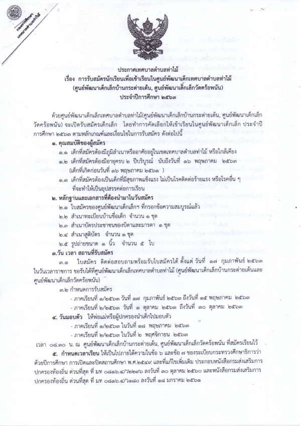 ศูนย์พัฒนาเด็กเล็กบ้านกระต่ายเต้น และ ศูนย์พัฒนาเด็กเล็กวัดคร้อพนัน เปิดรับสมัครนักเรียนเพื่อเข้าเรียนในศูนย์พัฒนาเด็กเล็กเทศบาลตำบลท่าไม้ ประจำปีการศึกษา ๒๕๖๓