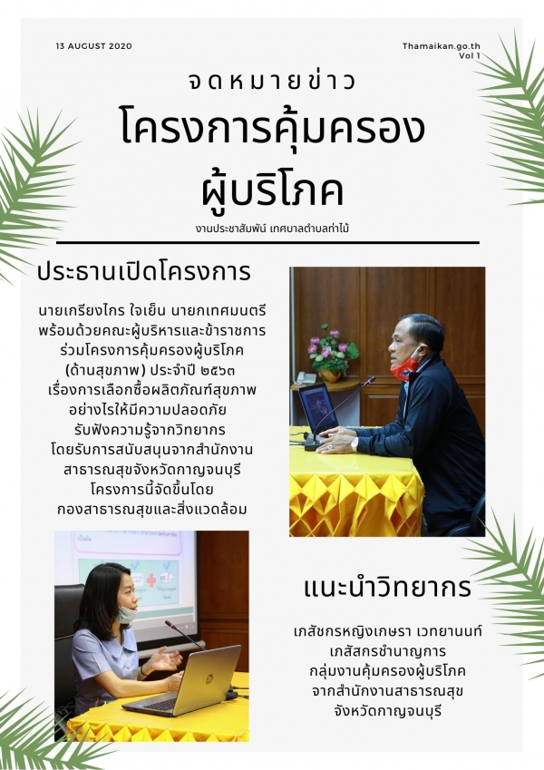 นายเกรียงไกร ใจเย็น นายกเทศมนรี พร้อมด้วยคณะผู้บริหาร และหัวหน้าส่วนราชการ ร่วมเปิดโครงการคุ้มครองผู้บริโภค ประจำปี ๒๕๖๓ เรื่อง การเลือกซื้อผลิตภัณฑ์สุขภาพอย่างปลอดภัย โดยได้รับการสนับสนุนวิทยากร จากสำนักงานสาธารณสุขจังหวัดกาญจนบุรี จัดโดยกองสาธารณสุขและสิ่งแวดล้อม
