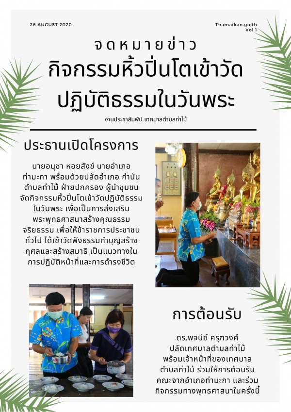 ดร.พจนีย์ ครุฑวงศ์ ปลัดเทศบาลตำบลท่าไม้ ให้การต้อนรับนายอนุชา หอยสังข์ นายอำเภอท่ามะกา พร้อมด้วยปลัดอำเภอท่ามะกา กำนันตำบลท่าไม้ ฝ่ายปกครอง ผู้นำชุมชน จัดกิจกรรมหิ้วปิ่นโตเข้าวัดปฏิบัติธรรมในวันพระ เพื่อเป็นการส่งเสริมพระพุทธศาสนาสร้างคุณธรรมจริยธรรมและเพื่อให้ข้าราชการประชาชนทั่วไป ได้เข้าวัดฟังธรรมทำบุญสร้างกุศลและสร้างสมาธิเพื่อเป็นแนวทางในการปฏิบัติหน้าที่และการดำรงชีวิตสร้างสัมพันธ์ไมตรีที่ดีระหว่างข้าราชการกับพี่น้องประชาชนในชุมชนต่างๆ ณ วัดกระต่ายเต้น