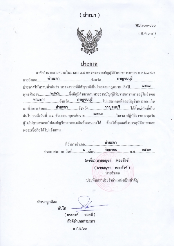 อำเภอท่ามะกา ประกาศและประชาสัมพันธ์ให้ชายไทย ที่เกิดปีมะแม พุทธศักราช ๒๕๔๖ ซึ่งมีภูมิลำเนาตามพระราชบัญญัติรับราชการทหารอยู่ในท้องที่อำเภอท่ามะกา ไปแสดงตนเพื่อลงบัญชีทหารกองเกิน ณ หน่วยสัสดีอำเภอท่ามะกา ตั้งแต่บัดนี้เป็นต้นไป จนถึงวันที่ ๓๑ ธันวาคม ๒๕๖๓ ในวันและเวลาราชการ ซึ่งหากเกินกำหนดเวลาที่ประกาศไปแล้วนั้น จะมีความผิดตามกฏหมาย