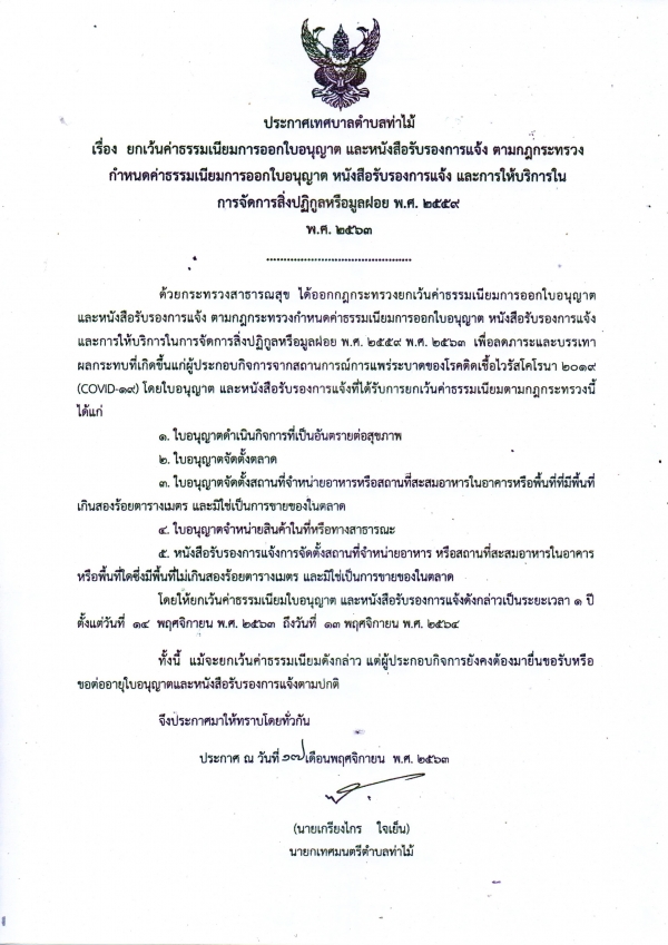 ประกาศเทศบาลตำบลท่าไม้ เรื่อง ยกเว้นค่าธรรมเนียมการออกใบอนุญาตและหนังสือรับรองการแจ้ง ตามกฏกระทรวงกำหนดค่าธรรมเนียมการออกใบอนุญาต หนังสือรับรองการแจ้งและการให้บริการในการจัดการสิ่งปฏิกูลหรือมูลฝอย พ.ศ.๒๕๕๙ พ.ศ.๒๕๖๓
