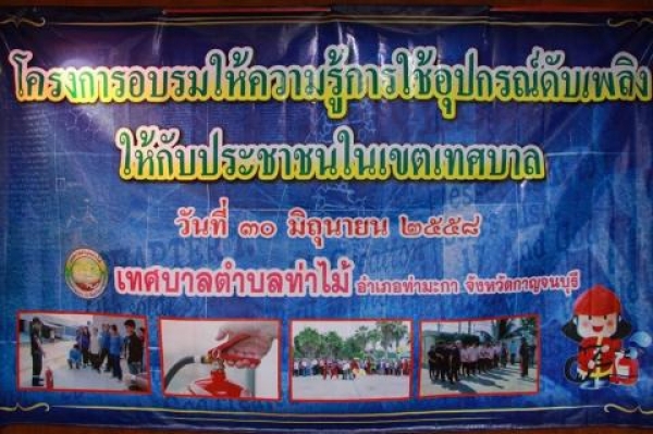 เทศบาลตำบลท่าไม้ จัดทำโครงการอบรมให้ความรู้การใช้อุปกรณ์ดับเพลิงให้กับประชาชนในเขตเทศบาล โดยมีนานเกรียงไกร ใจเย็น นายกเทศมนตรี เป็นประธานการเปิดงาน พร้อมด้วยนายบุญเยี่ยม บุญแก้ว รองนายกเทศมนตรี นายสนาม ทัดสวน ที่ปรึกษาฯ นายสนธยา เจริญสุข สมาชิกสภาฯ นางสาวพจนีย์ ครุฑวงศ์ ปลัดเทศบาล นางสุริย์ริสสา พึ่งไทย รองปลัด นางปาลิดา เพ็ชรกล้า ผอ.กองคลัง นายดุสิต ทันสมัย ผอ.กองสาธารณสุขฯ นายูเกียรติ วงศ์สารคาม ผอ.กองช่าง ผู้นำชุมชนจากหมู่ต่างๆ และประชาชนชาวตำบลท่าไม้ ทั้งนี้เพื่อเพิ่มความรู้ความเข้าใจและประสิทธิภาพในการระวังป้องกันให้ดียิ่งขึ้น จึงจำเป็นจะต้องมีการฝึกฝนเรียนรู้อย่างสม่ำเสมอจากผู้ชำนาญการ โดยได้เชิญคุณวิทยา สมจริยา หัวหน้าฝ่ายปกครอง เทศบาลตำบลปากแพรก มาเป็นวิทยากรในครั้งนี้ และปิดโครงการด้วยการมอบถังดับเพลิงให้กับชุมชนและวุฒิบัตรสำหรับผู้ที่ผ่านการอบรมตามโครงการดังกล่าว โดยรับมอบจากท่านนายกเทศมนตรีตำบลท่าไม้