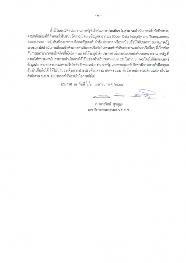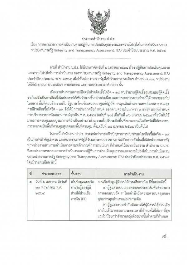 เรื่อง การขยายเวลาการดำเนินงานตามปฏิทินการประเมินคุณธรรมและความโปร่งใสของการดำเนินงานของหน่วยงานภาครัฐ (ITA)