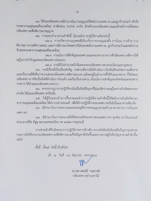 เรื่อง มอบหมายให้รองปลัดเทศบาลปฏิบัติราชการแทนปลัดเทศบาล