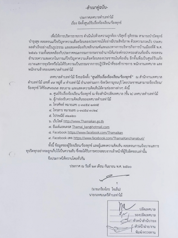เรื่อง การจัดตั้งศูนย์รับเรื่องร้องเรียนร้องทุกข์