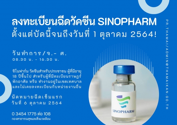 เรื่อง เปิดรับลงทะเบียนฉีดวัคซีน "ซิโนฟาร์ม" (เข็มที่ 1 วันที่ 6 ตุลาคม 2564)