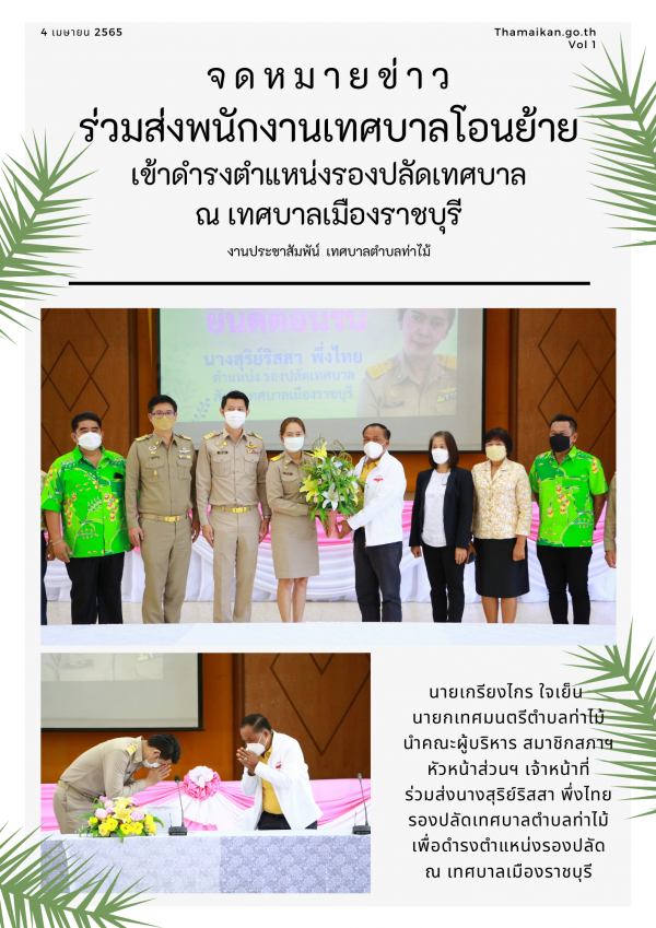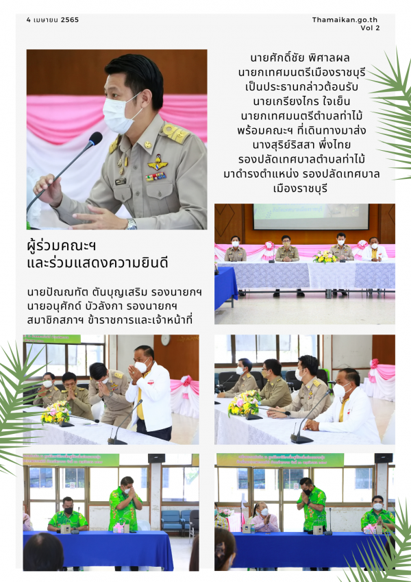 จดหมายข่าว : นายเกรียงไกร ใจเย็น นายกเทศมนตรีตำบลท่าไม้ พร้อมคณะ เดินทางไปร่วมแสดงความยินดีกับนางสุริย์ริสสา พึ่งไทย ตำแหน่ง รองปลัดเทศบาลตำบลท่าไม้ เพื่อเข้าดำรงตำแหน่งเป็นรองปลัดเทศบาล ณ เทศบาลเมืองราชบุรี