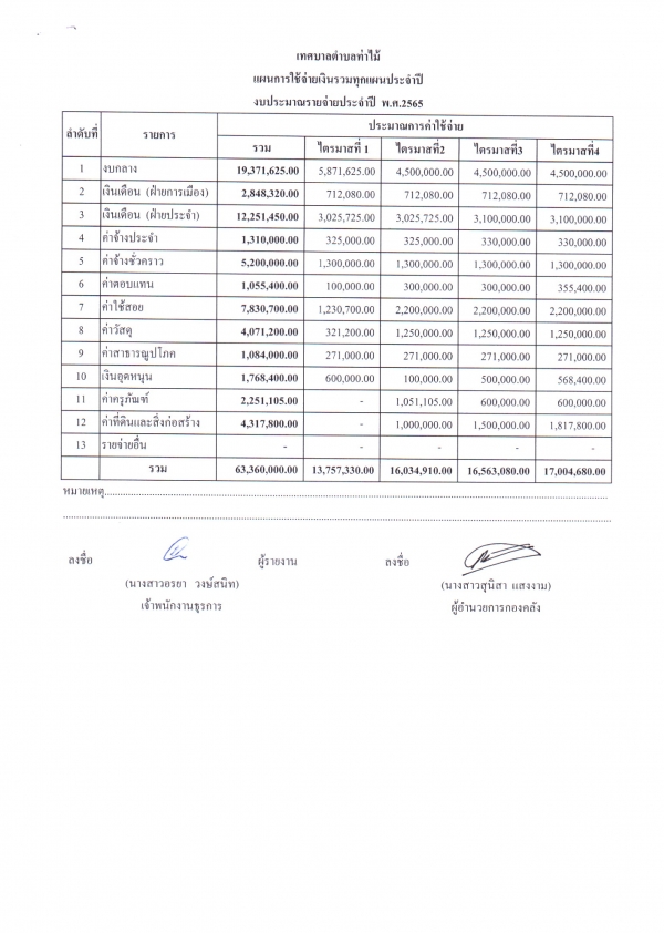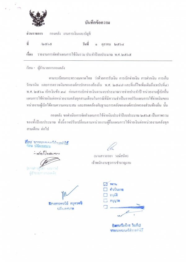 เรื่อง รายงานการจัดทำแผนการใช้เงินรวม ประจำปีงบประมาณ 2565