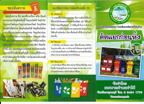 ร่วมเป็นส่วนหนึ่งในการลดปริมาณขยะลงด้วยตัวของเราเอง ด้วยการคัดแยกประเภทของขยะก่อนนำไปทิ้งทกครั้ง เพื่อให้ง่ายต่อการคัดแยกขยะก่อนนำไปกำจัดหรือใช้ประโยชน์ต่อไปได้