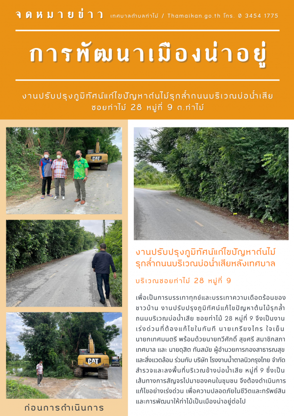 เพื่อเป็นการบรรเทาทุกข์และบรรเทาความเดือดร้อนของชาวบ้าน งานปรับปรุงภูมิทัศน์แก้ไขปัญหาต้นไม้รุกล้ำถนนบริเวณบ่อน้ำเสีย ซอยท่าไม้ 28 หมู่ที่ 9 จึงเป็นงานเร่งด่วนที่ต้องแก้ไขในทันที นายเกรียงไกร ใจเย็น นายกเทศมนตรี พร้อมด้วยนายทวีศักดิ์ สุขศรี สมาชิกสภา เทศบาล และ นายดุสิต ทันสมัย ผู้อำนวยการกองสาธารณสุขและสิ่งแวดล้อม ร่วมกับ บริษัท โรงงานน้ำตาลนิวกรุงไทย จำกัด สำรวจและลงพื้นที่บริเวณข้างบ่อน้ำเสีย หมู่ที่ 9 ซึ่งเป็นเส้นทางการสัญจรไปมาของคนในชุมชน จึงต้องดำเนินการแก้ไขอย่างเร่งด่วน เพื่อความปลอดภัยในชีวิตและทรัพย์สินและการพัฒนาให้ท่าไม้เป็นเมืองน่าอยู่ต่อไป