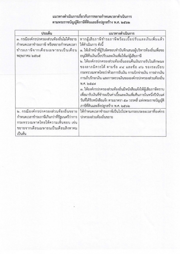 ๒. ขยายกำหนดเวลาของผู้เสียภาษีในการผ่อนชำระภาษี ตามมาตรา ๕๒ วรรคสอง แห่งพระราชบัญญัติภาษีที่ดินและสิ่งปลูกสร้าง พ.ศ. ๒๕๖๒ และข้อ ๓ ของกฎกระทรวงการผ่อนชำระภาษีที่ดินสิ่งปลูกสร้าง พ.ศ. ๒๕๖๒ ดังนี้