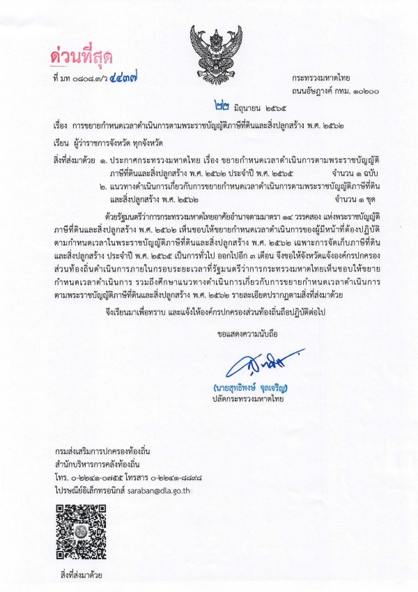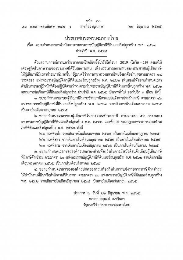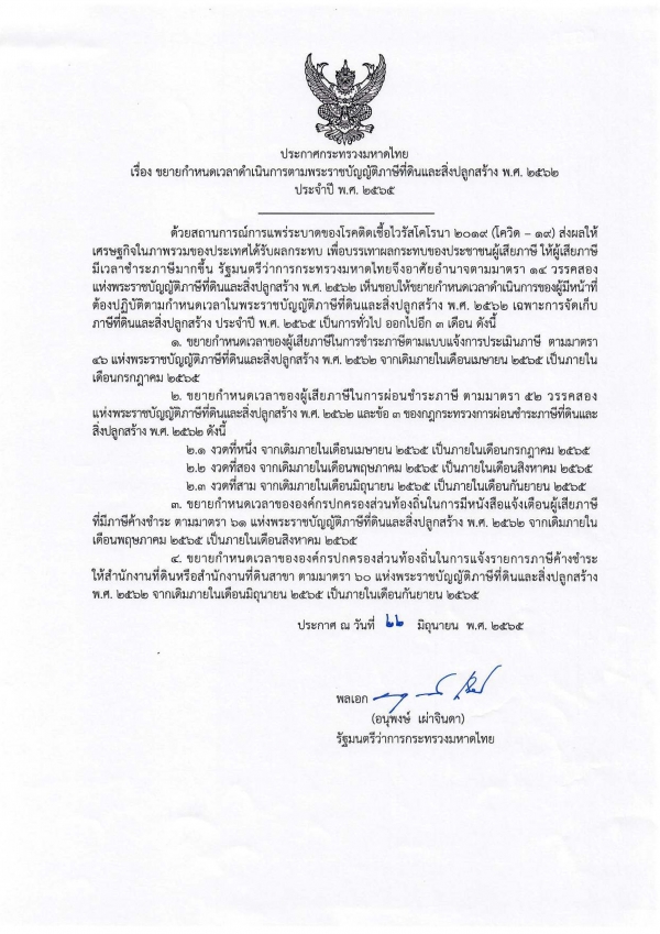 ประกาศกระทรวงมหาดไทย เรื่อง ขยายกำหนดเวลาดำเนินการตามพระราชบัญญัติภาษีที่ดินและสิ่งปลูกสร้าง พ.ศ. ๒๕๖๒ ประจำปี พ.ศ. ๒๕๖๕
