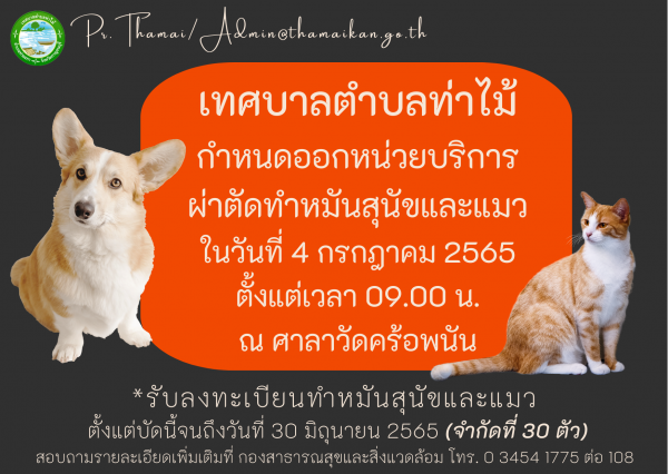 เทศบาลตำบลท่าไม้ จึงได้ร่วมกับ ปศุสัตว์จังหวัดกาญจนบุรี จัดกิจกรรมผ่าตัดทำหมันสุนัขและแมวภายในเขตเทศบาลตำบลท่าไม้ ในวันที่ 4 กรกฎาคม 2565 เวลา 09.00 น. ณ ศาลาการเปรียญวัดคร้อพนัน