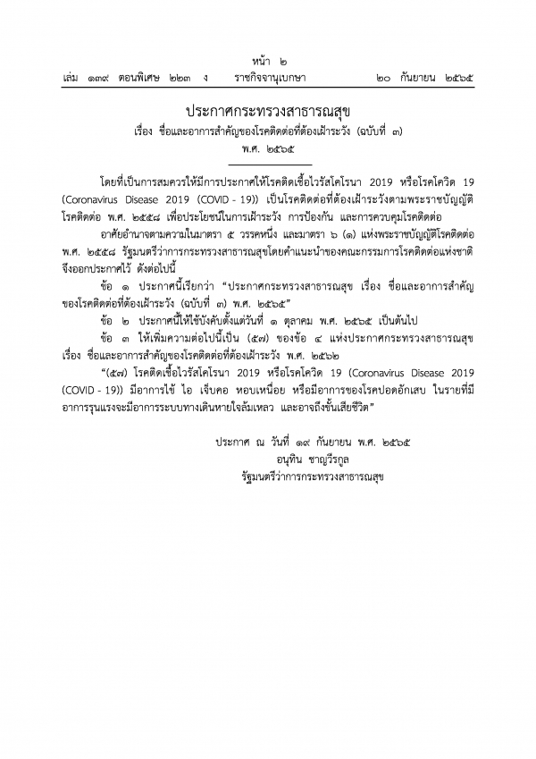 2) ประกาศเรื่องชื่อและอาการสำคัญของโรคติดต่อที่ต้องเฝ้าระวัง (ฉบับที่ 3) พ.ศ. 2565