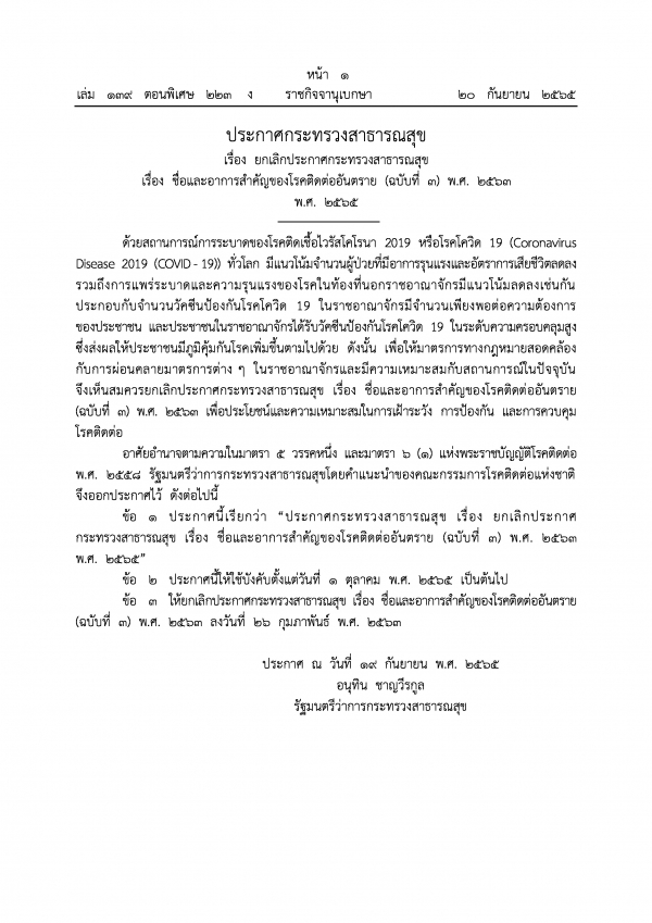 1) ประกาศกระทรวงสาธารณสุข เรื่องยกเลิกประกาศกระทรวงสาธารณสุข เรื่องชื่อและอาการสำคัญของโรคติดต่ออันตราย (ฉบับที่ 3) พ.ศ. 2563 พ.ศ. 2565