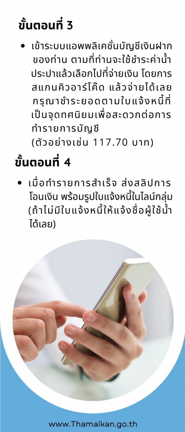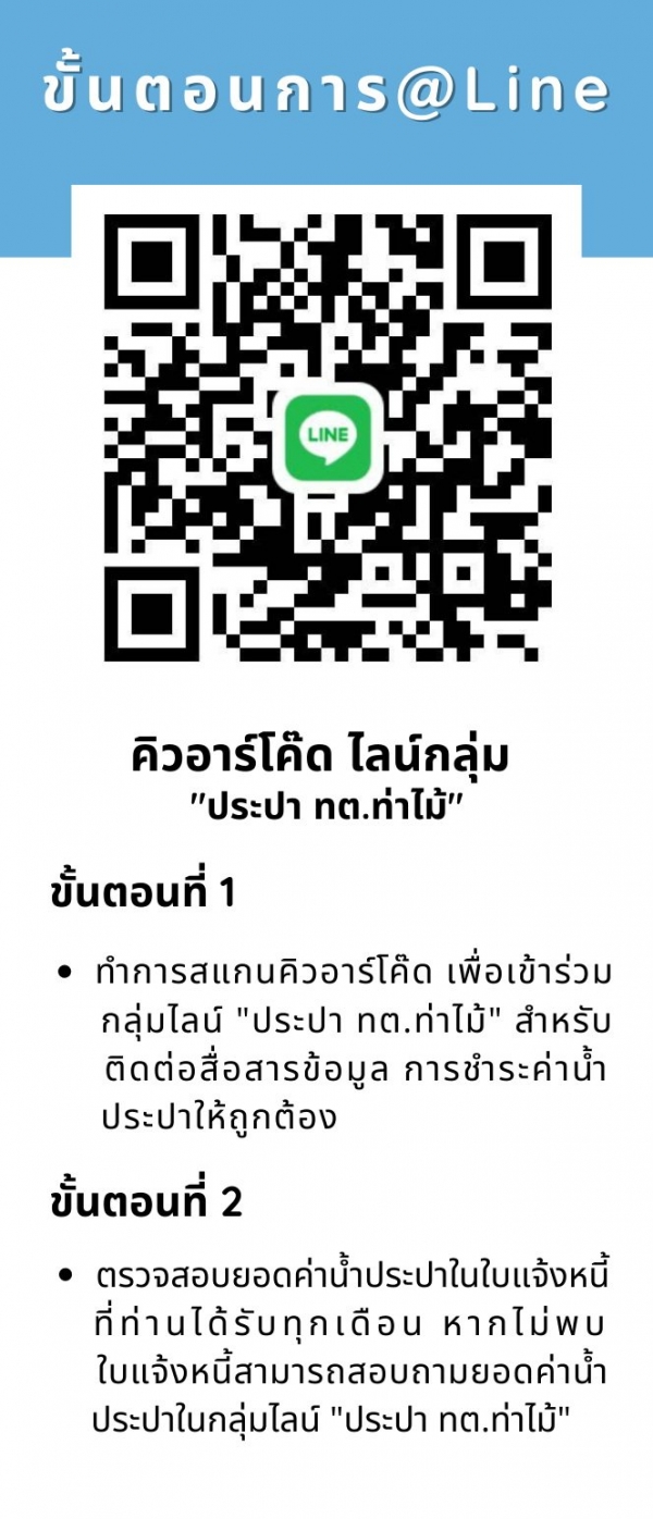 โดยเมื่อผู้ใช้น้ำประปาได้รับใบแจ้งหนี้ค่าน้ำประปา ให้ทำการสแกน QR Code เพื่อเข้าร่วมกลุ่มไลน์ “ประปา ทต.ท่าไม้” และเข้าระบบแอพพลิเคชั่นบัญชีเงินฝากของท่าน โดยการสแกน QR Code แล้วจ่ายค่าน้ำประปา เทศบาลตำบลท่าไม้ (งบเฉพาะการประปา) เมื่อเจ้าหน้าที่ทำการตรวจสอบการชำระค่าน้ำประปาตรงตามยอดค่าน้ำประปาถูกต้องแล้ว จะนำส่งใบเสร็จให้ท่านพร้อมใบแจ้งหนี้ของเดือนถัดไป