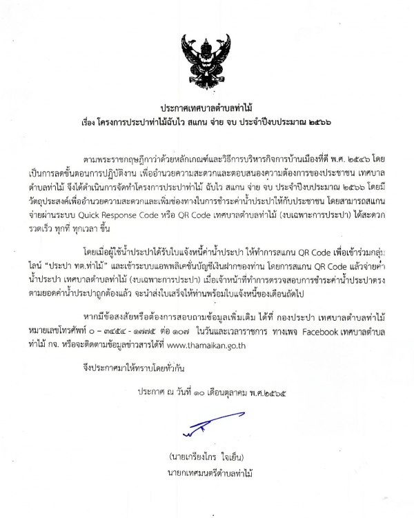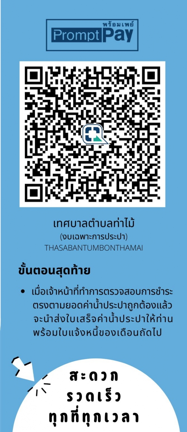 โดยมีวัตถุประสงค์เพื่ออำนวยความสะดวกและเพิ่มช่องทางในการชำระค่าน้ำประปาให้กับประชาชน โดยสามารถสแกนจ่ายผ่านระบบ Quick Response Code หรือ QR Code เทศบาลตำบลท่าไม้ (งบเฉพาะการประปา) ได้สะดวก รวดเร็ว ทุกที่ ทุกเวลา ขึ้น