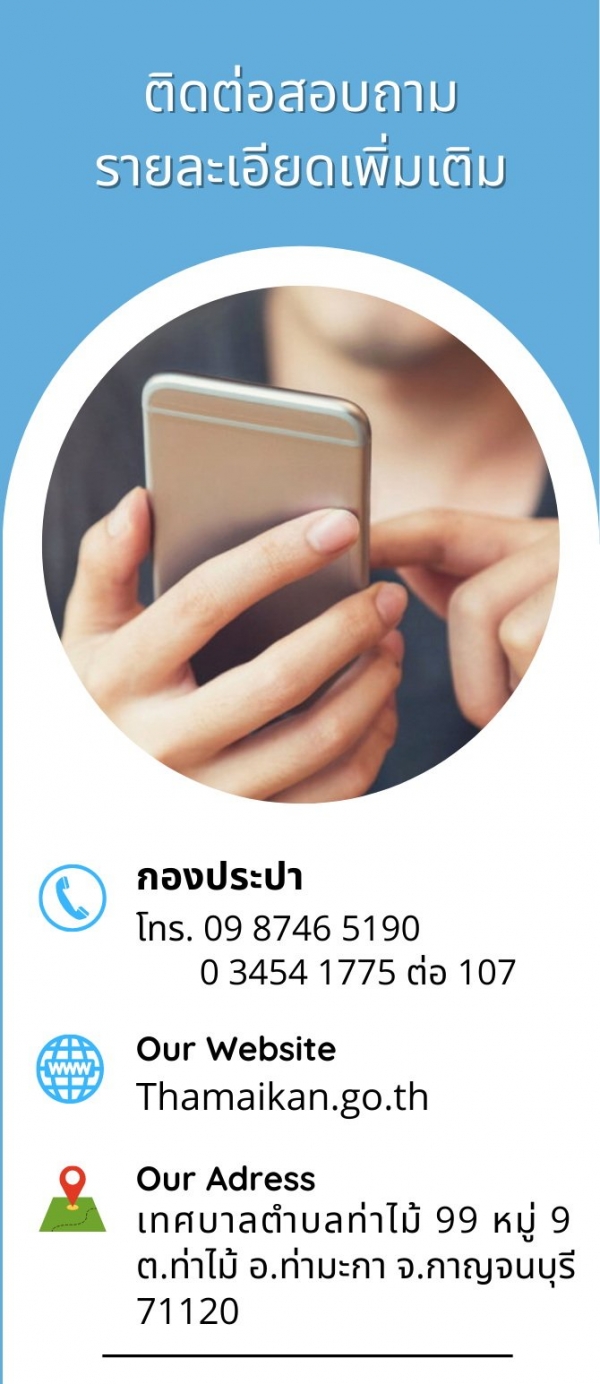 หากมีข้อสงสัยหรือต้องการสอบถามข้อมูลเพิ่มเติม ได้ที่ กองประปา เทศบาลตำบลท่าไม้ หมายเลขโทรศัพท์ 0 3454 1775 ต่อ 107 ในวันและเวลาราชการ ทางเพจ Facebook เทศบาลตำบล ท่าไม้ กจ. หรือจะติดตามข้อมูลข่าวสารได้ที่ www.thamaikan.go.th