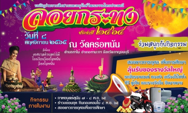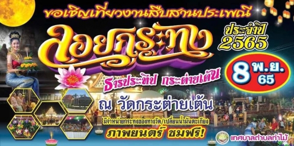 เทศบาลตำบลท่าไม้ ร่วมกับ วัดกระต่ายเต้น วัดคร้อพนัน และคณะครูโรงเรียนวัดคร้อพนัน ขอเชิญทุกท่านร่วมงานสืบสานและอนุรักษ์วัฒนธรรมไทยประเพณีลอยกระทง "The colors of the river" ประจำปี 2565 ในวันอังคารที่ 8 พฤศจิกายน 2565 ตั้งแต่เวลา 17.00 น. เป็นต้นไป โดยมีกิจกรรมภายในงาน ดังนี้