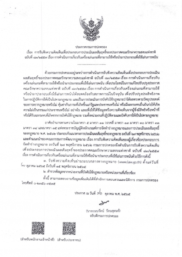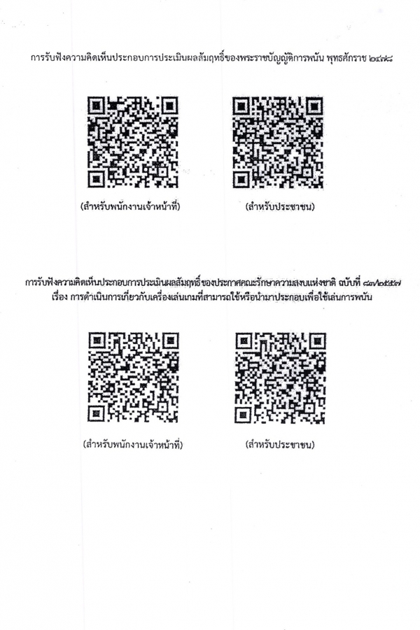 เรื่อง การรับฟังความคิดเห็นประกอบการประเมินผลสัมฤทธิ์ของพระราชบัญญัติการพนัน พุทธศักราช 2478 และประกาศคณะรักษาความสงบแห่งชาติ ฉบับที่ 13/2557 เรื่อง การดำเนินการเกี่ยวกับเครื่องเล่นเกม ที่สามารถใช้หรือนำมาประกอบเพื่อใช้เล่นการพนัน
