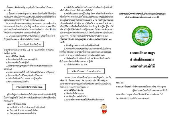 เรื่อง เอกสารแนะนำการติดต่อขอรับบริการงานทะเบียนราษฎร สำนักทะเบียนท้องถิ่นเทศบาลตำบลท่าไม้