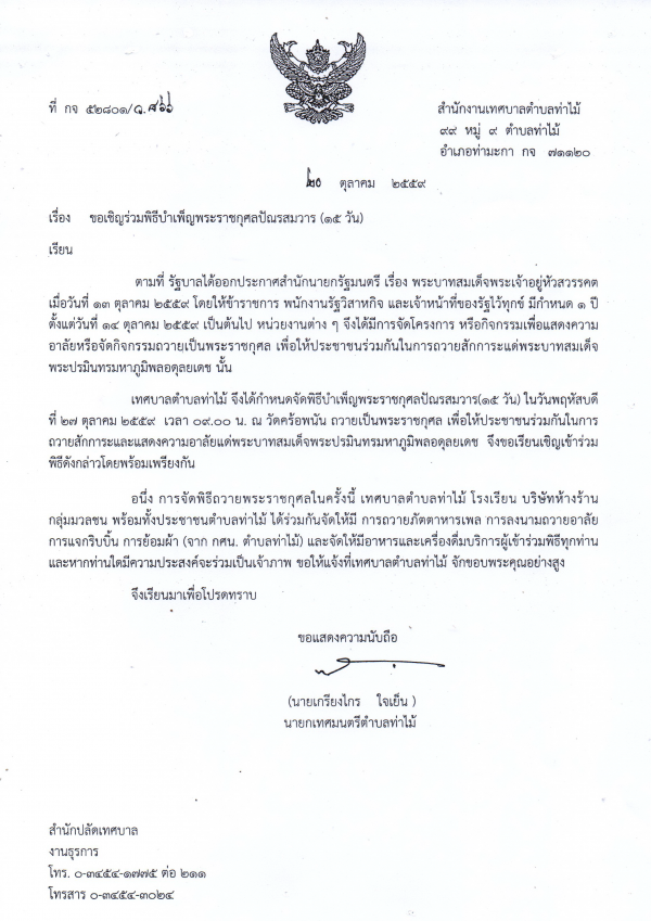 ขอเชิญชวนประชาชนชาวตำบลท่าไม้ ร่วมพิธีบำเพ็ญพระราชกุศลปัณรสมวาร (๑๕ วัน) และพิธีลงนามถวายความอาลัย แด่พระบาทสมเด็จพระปรมินทรมหาภูมิพลอดุลยเดช