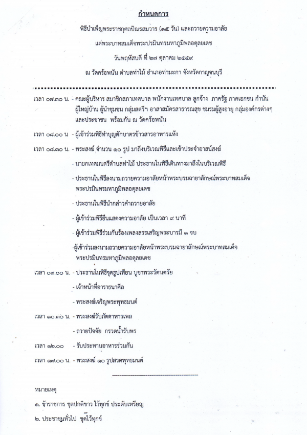 เทศบาลตำบลท่าไม้ ขอเชิญชวนประชาชนชาวตำบลท่าไม้ ร่วมพิธีบำเพ็ญพระราชกุศลปัณรสมวาร (๑๕ วัน) และพิธีลงนามถวายความอาลัย แด่พระบาทสมเด็จพระปรมินทรมหาภูมิพลอดุลยเดช ในวันพฤหัสบดีที่ ๒๗ ตุลาคม ๒๕๕๙ ตั้งแต่เวลา ๐๗.๓๐ น. เป็นต้นไป ณ ศาลาการเปรียญวัดคร้อพนันค่ะ ในช่วงเช้าร่วมพิธีทำบุญตักบาตรข้าวสารอาหารแห้ง ร่วมร้องเพลงสรรเสริญพระบารมี พระสงฆ์เจริญพระพุทธมนต์ พระสงฆ์รับภัตตาหารเพล กิจกรรมอื่นๆ บริการย้อมผ้าให้กับประชาชนทั่วไป การแจกริบบิ้นสีดำ บริษัท ห้างร้านต่างๆ และประชาชนทั่วไป นำอาหารคาว หวาน เครื่องดื่ม มาบริการให้กับผู้ที่เข้าร่วมงาน ฟรี! ทุกรายการค่ะ จึงใครขอเรียนเชิญทุกท่านเข้าร่วมพิธีบำเพ็ญพระราชกุศลปัณรสมวาร (๑๕ วัน) ตามวัน เวลา และสถานที่ดังกล่าวโดยพร้อมเพรียงกัน รายละเอียดเพิ่มเติมตามกำหนดการด้านล่างนี้ค่ะ