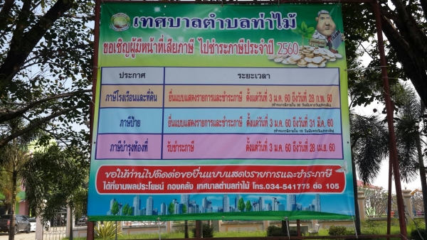กองคลัง เทศบาลตำบลท่าไม้ ขอเชิญผู้มีหน้าที่เสียภาษีไปชำระภาษีประจำปี ๒๕๖๐ เพื่อให้การจัดเก็บรายได้เป็นไปอย่างทั่วถึงและเป็นไปตามระยะเวลาที่กำหนด และให้การบริหารงานพัฒนาท้องถิ่นเป็นไปอย่างมีประสิทธิภาพ รับยื่นแบบแสดงรายการเพื่อเสียภาษี ณ สำนักงานเทศบาลตำบลท่าไม้ ตั้งแต่วันที่ ๔ มกราคม ๒๕๖๐ ในวันจันทร์ถึงวันศุกร์ เวลา ๐๘.๓๐ น. - ๑๖.๓๐ น. เว้นวันหยุดราชการ ติดต่อสอบถามเพิ่มเติมได้ที่ โทร. ๐ ๓๔๕๔ ๑๗๗๕ ต่อ ๑๐๕ ค่ะ